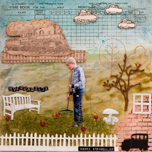 Plast blomster fra Magic Monday, buttons fra Maren&Andrine, tre-chipboard fra Prima og overlay fra LYB. Ellers har jeg brukt litt restepapir, bånd og washitape.